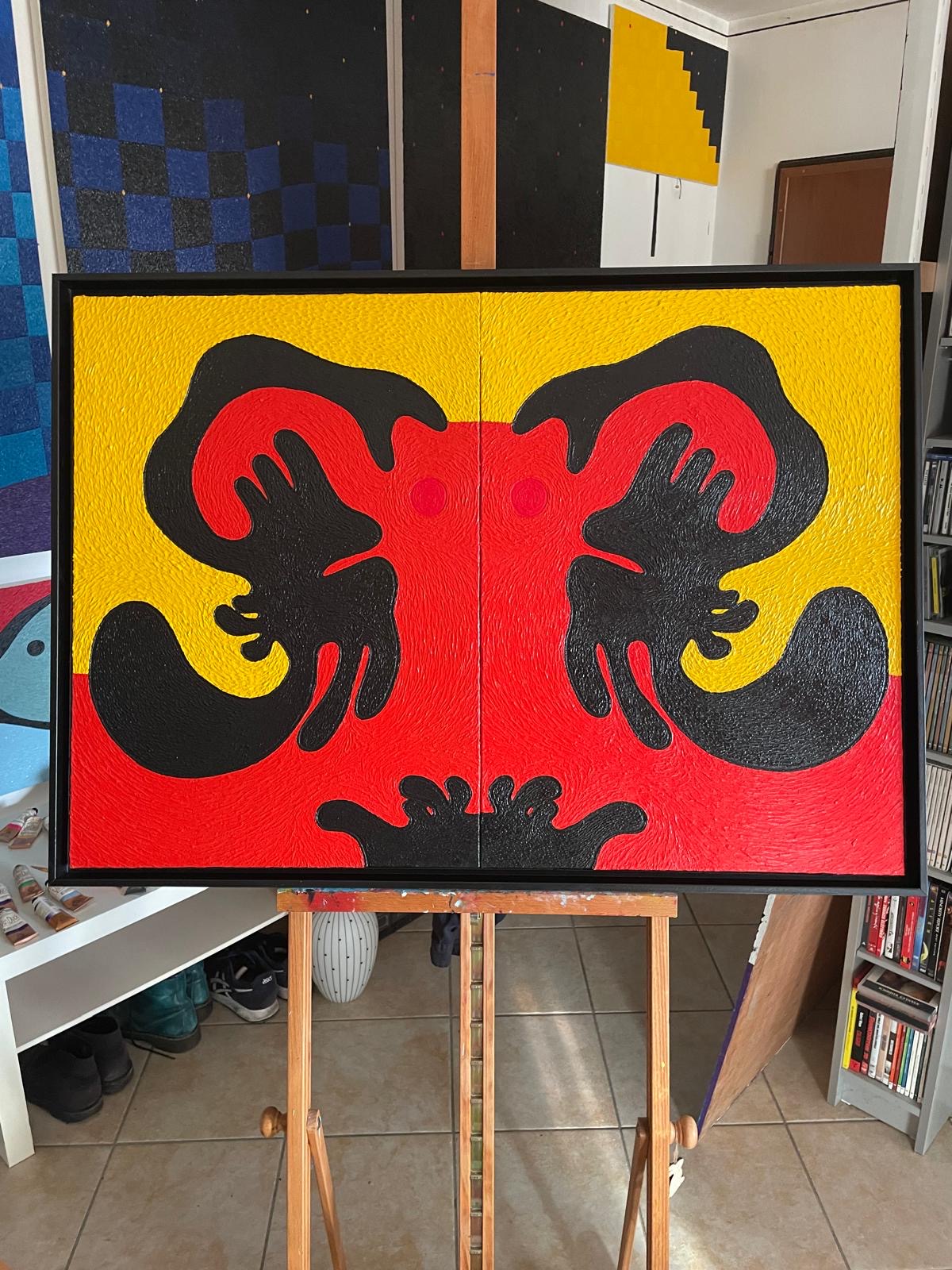 Nel tempo, da quei tratti sono nate creature multiformi, simboliche, visionarie. La mia pittura ha preso una direzione astratta, onirica, carica di simboli e suggestioni interiori. Le mie tele sono mondi intimi, costruiti con grumi di colore, intrecci geometrici e una gamma cromatica sempre in movimento. Nulla è lasciato al caso: ogni forma, ogni tinta, racconta una parte di me.